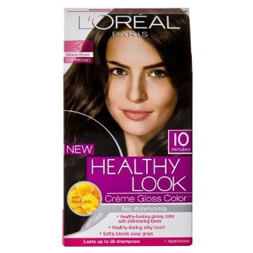 Healthy look gives you natural-looking color with glossy, healthy-looking shine in just 10 little minutes. The ammonia-free formula deeply nourishes hair while also helping to counter dullness and prevent damage. The crème formula softly blends away gray. See all L'Oreal Paris Healthy Look Crème Gloss Color, Darkest Brown/Espresso 3OverviewRelateItems